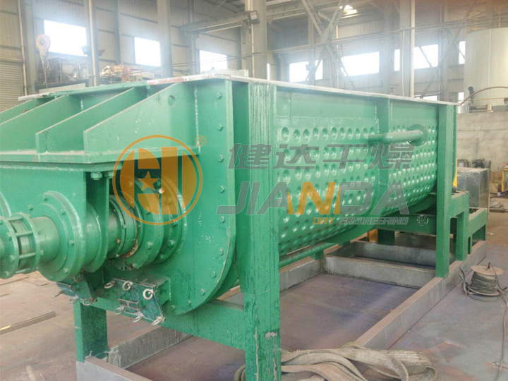 空心轴上密集排列着楔型中空浆叶,热介质经空心轴流经浆叶。单位有效容积内传热面积很大,热介质温度从-40℃到320℃,可以是水蒸汽,也可以是液体型:如热水、导热油等。间接传导加热,没有携带空气带走热量,热量均用来加热物料。热量损失仅为通过器体保温层向环境的散热。楔型浆叶传热面具有自清洁功能。物料颗粒与楔型面的相对运动产生洗刷作用,能够洗刷掉楔型面上附着物料,使运转中一直保持着清洁的传热面。浆叶干燥机的壳体为Ω型,壳体内一般安排二到四根空心搅拌轴。壳体有密封端盖与上盖,防止物料粉尘外泄而充分发挥作用。